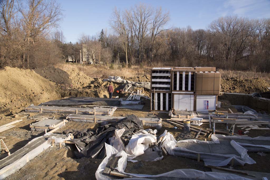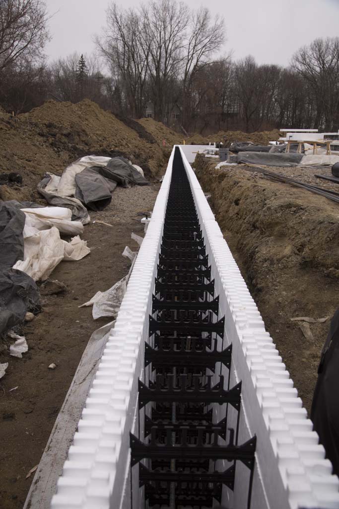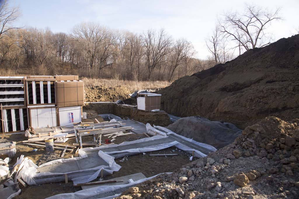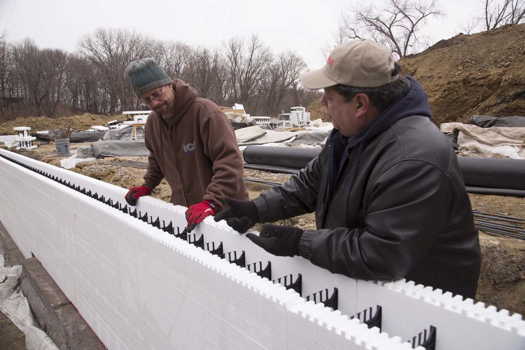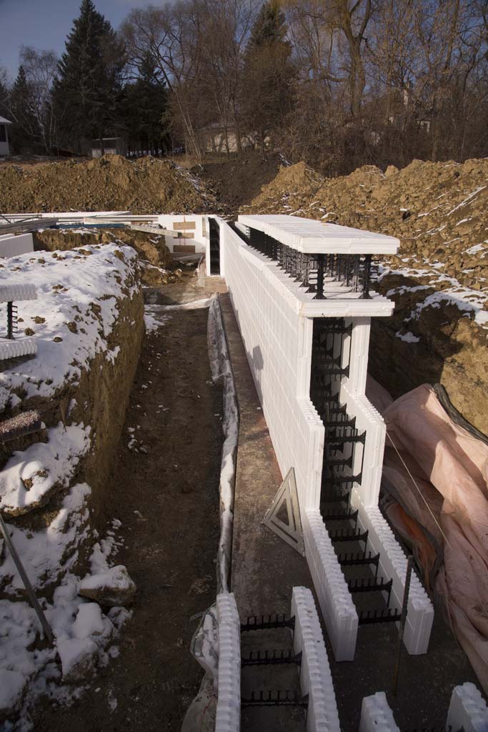 Onsite for portions of the project were Brian Corder and Dennis Micoff with BuildBlock and supervising the installation was Brad Kvanbek and his team at ICF Construction. Brad is a veteran of ICF installation throughout Minnesota. He and his team supervised the excavation and pouring of the footings, and the installation and pour of the frost wall. The next step after the frost wall was poured (and the 12 inches of snow were melted) was to finish stacking the basement walls and pouring the final courses of ICF.