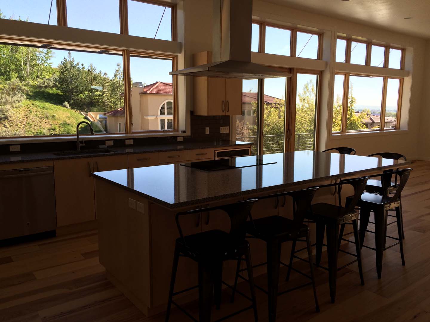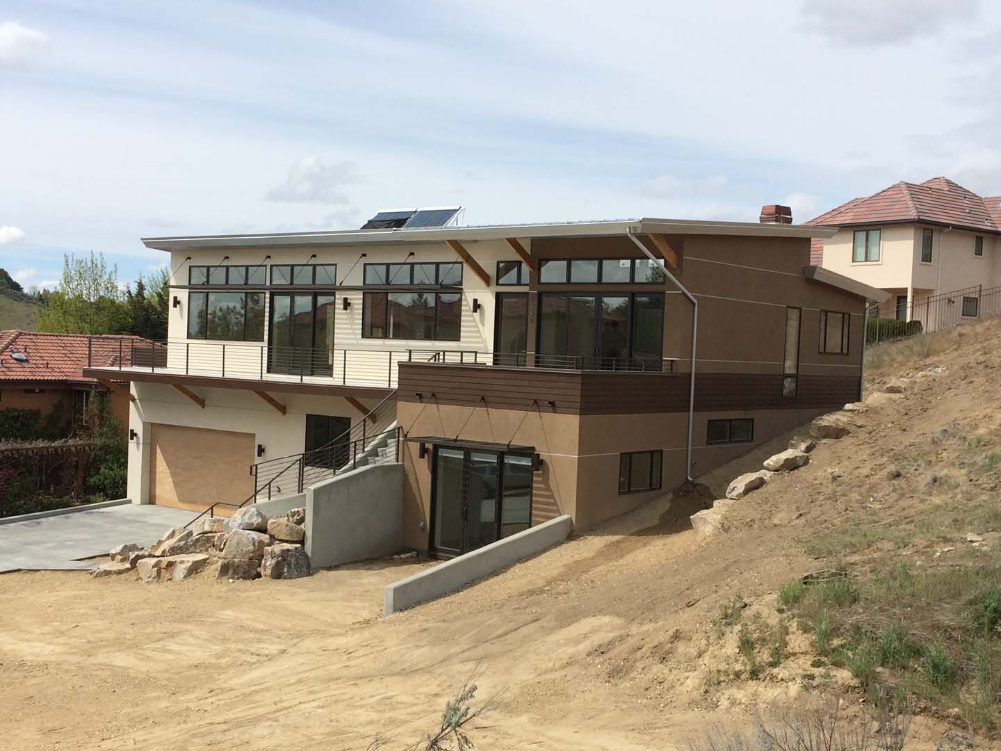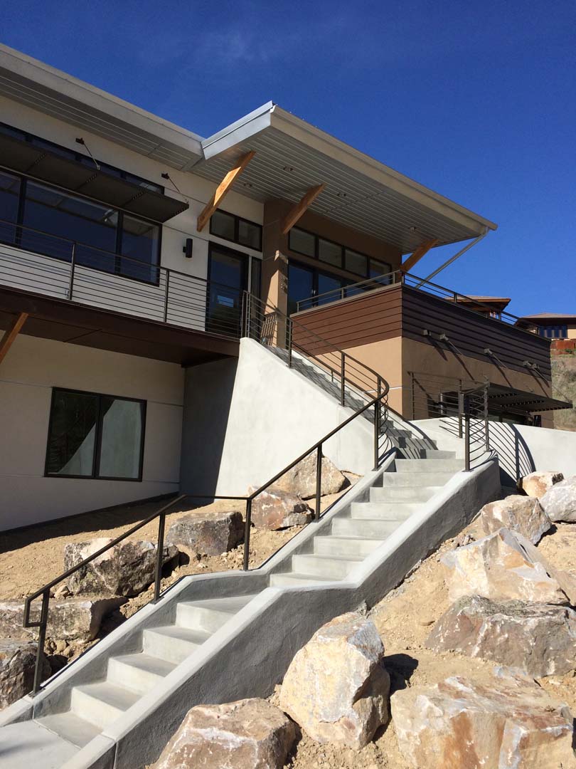 This project is a beautiful modern design. The home features large open spaces, wood features with metal trim, granite countertops, and lots of natural light. The large glass windows are positioned to maximize solar gain in the winter and keep the house cool in the summer. The second story includes a wrap around balcony that cantilevers out over the first floor. The front door of the home is on the second floor and is accessible via a perfectly poured concrete staircase.