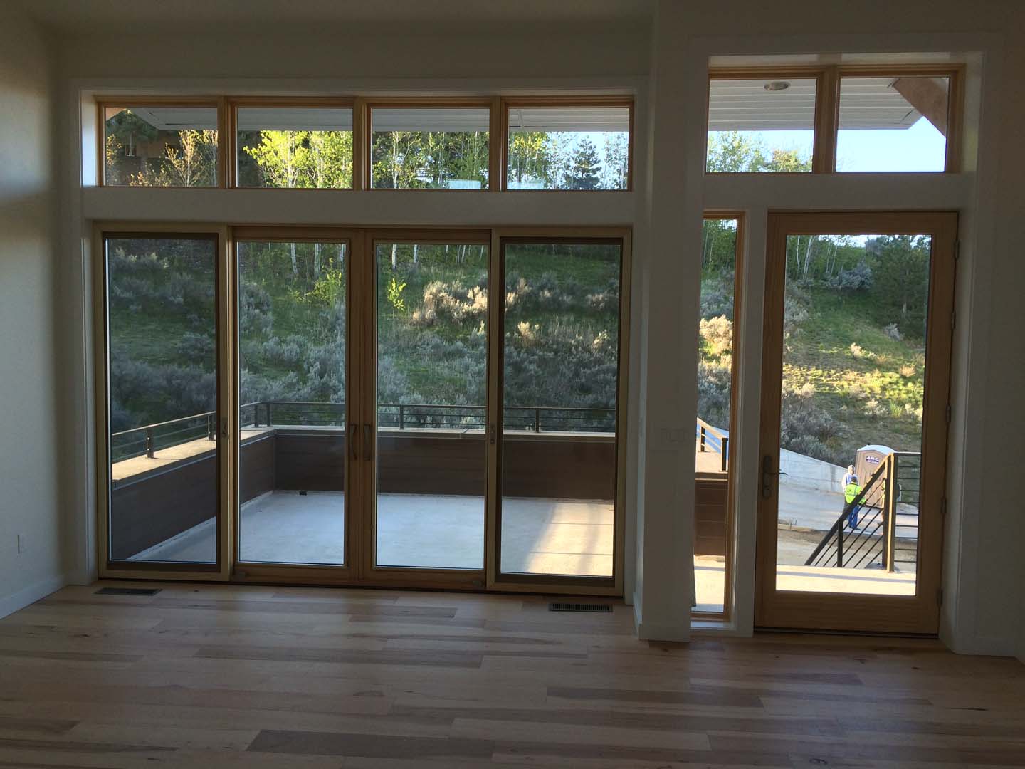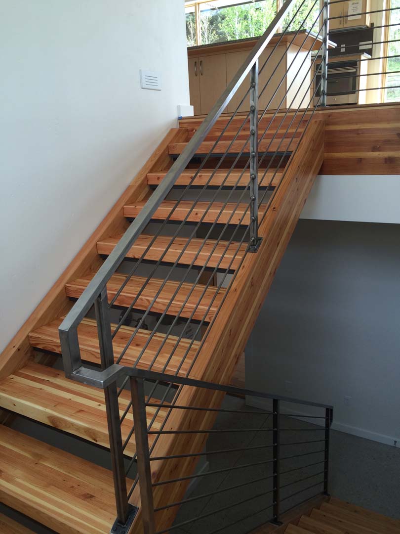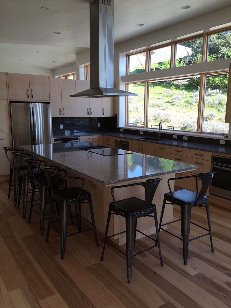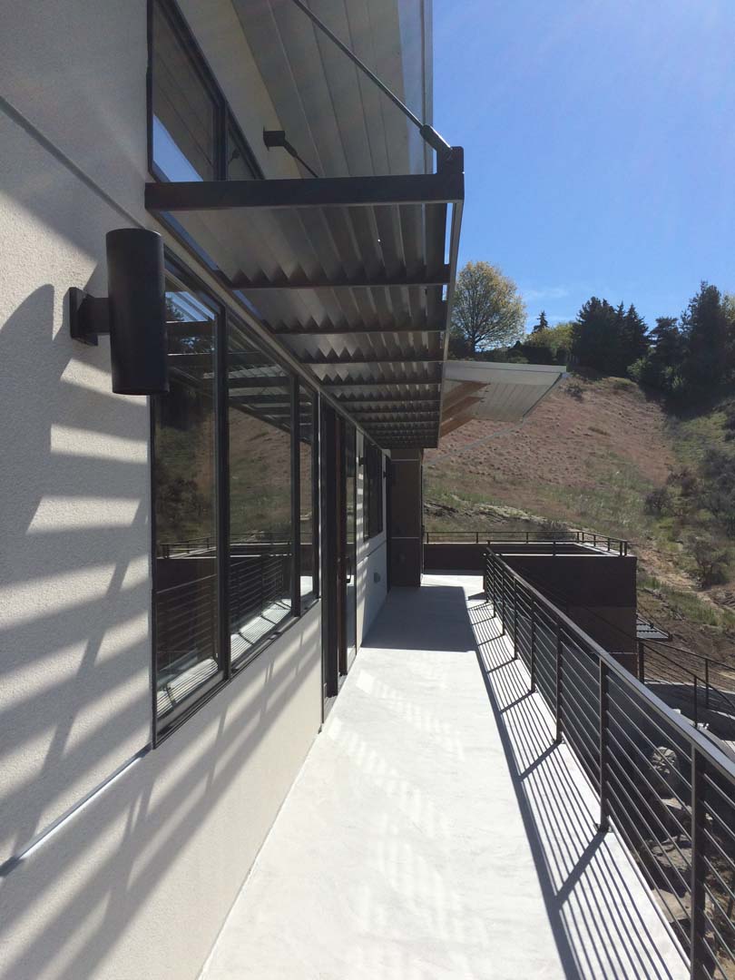 This project is a beautiful modern design. The home features large open spaces, wood features with metal trim, granite countertops, and lots of natural light. The large glass windows are positioned to maximize solar gain in the winter and keep the house cool in the summer. The second story includes a wrap around balcony that cantilevers out over the first floor. The front door of the home is on the second floor and is accessible via a perfectly poured concrete staircase.